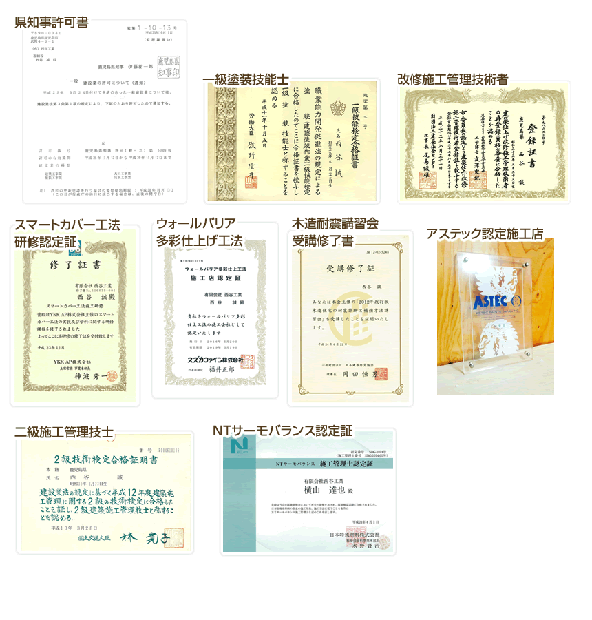 また、一級塗装技能士はもちろん、住宅の劣化箇所を探すプロの資格ホームインスペクター(住宅診断士)、増改築相談員指導員免許も取得して、業界の方たちに指導しております。