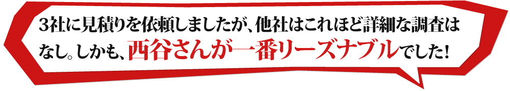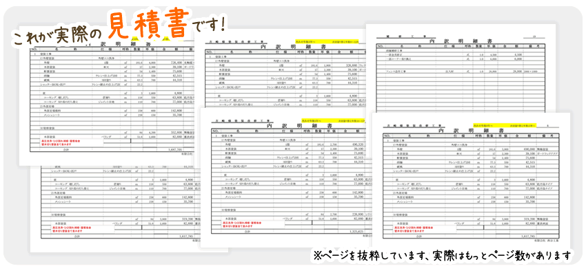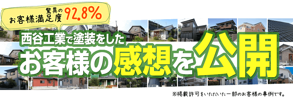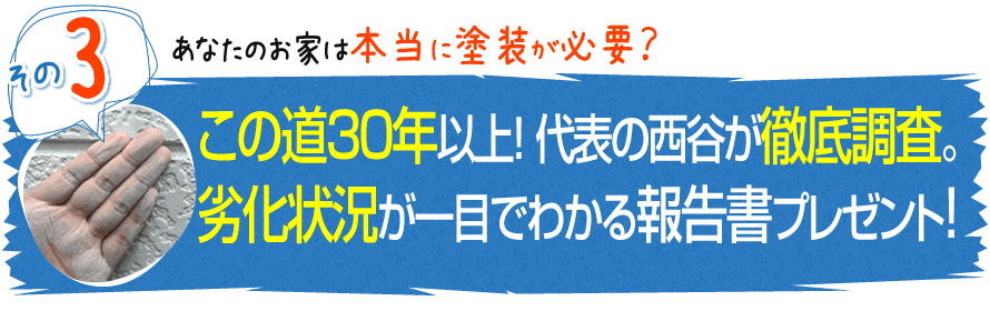 塗装業界は、最初に安い料金を提示して後で追加料金を取り、結局は高額になる…というようなこともありますが、西谷工業では、徹底した建物の劣化診断を元に見積書を作成するので、追加料金がかかることもありません。