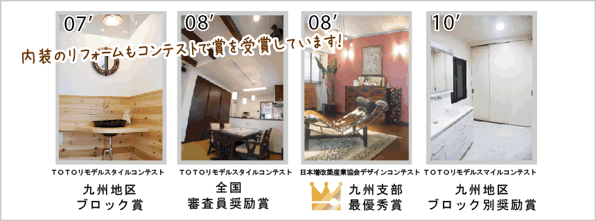 私も職人ですから、ただ対応できるだけは満足できず、今ではTOTO様やYKK様や各リフォームコンテストで賞を受賞するほどになりました。若いころ修業した大工や左官の技術が今生きております。