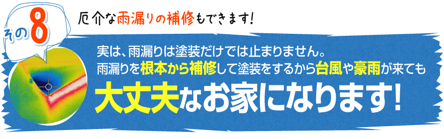 もし、雨漏りがある場合や雨漏りの不安がある方は、私達なら雨漏りを補修したあとに、しっかりと塗装するので、新築以上に綺麗で上部なお家になるので、台風が来ても安心して暮らすことが可能です。
