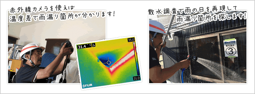 西谷工業では、散水調査と赤外線調査で、雨漏りの原因を徹底的に調査します。また、自社だけの施工実績だけではなく、日本最大級の雨漏り補修団体「雨もり119」にも加盟しているので、全国13,000件の施工実績と補修方法を共有しています。